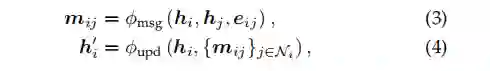 节点特征hi、hj和边特征eij首先由消息函数合成以获得消息mij。然后,邻居中的消息通过一组函数进行聚合,并与输入hi结合,用于更新节点特征h'i。由等式(3)和(4)定义的GNNs总是排列同态但并不具有内在的E(3)-同态性。 4.2 不变图神经网络