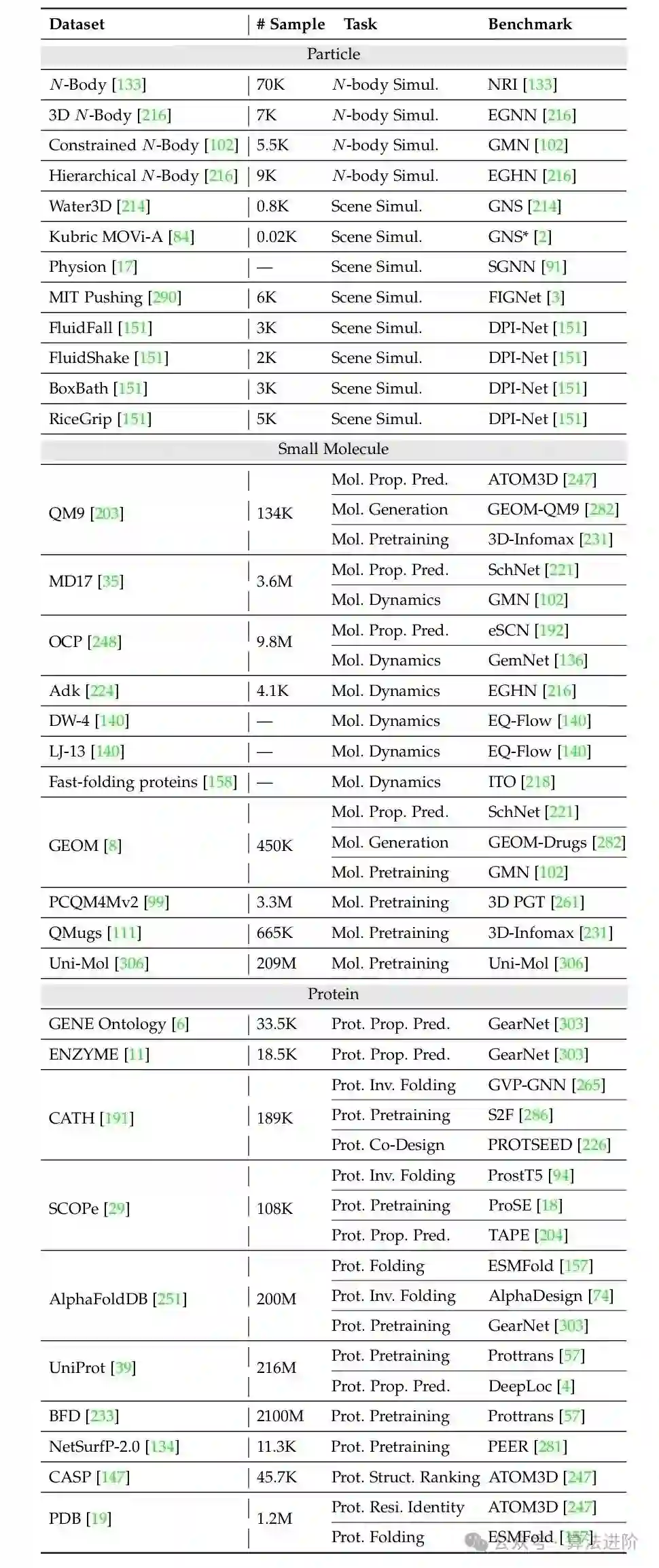 本部分回顾了与几何图学习相关的应用,根据系统类型对现有方法进行了分类,涵盖颗粒、分子、蛋白质等任务,如表3所示。表4和表5总结了单实例和多实例任务数据集。重点讨论了利用几何GNNs的方法,但其他方法如基于序列的方法也适用。表3 各种几何GN的任务概括。生成任务指的是可以通过生成模型解决的那些任务,否则被称为非生成任务。可以用生成模型或非生成模型解决的那些任务被称为混合任务。 表4 单实例应用典型数据集和基准的总结