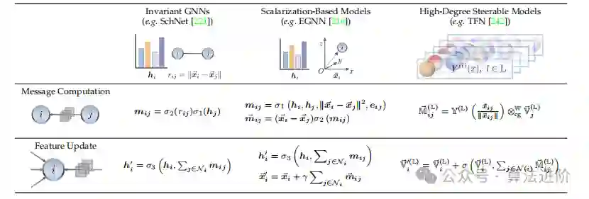 等变图神经网络(equivariant GNNs)同时更新不变特征和同态特征,适用于需要同态输出的实际任务。等变GNNs将几何图上的函数设计为满足特定条件,通过信息传递推导出几何消息,并在图由连通性或邻接矩阵指定的邻域内进行聚合,考虑输入特征进行更新。目前实现等变GNNs的具体形式有不同的方法,分为标量化模型和高阶可调模型。 4.3.1 基于标量化的模型