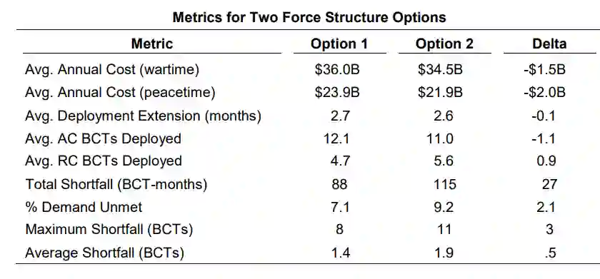 从指标中,用户可以看到方案 2 的总缺口增加了约 30%,在此战时情景下从 88 个 BCT 月增加到 115 个 BCT 月。平均每年成本(战时)的三角洲反映了 每年平均成本(战时)的三角洲主要反映出方案 1 比方案 2 部署更多,满足的需求更多。部署通常是单元周期中最昂贵的阶段;因此,短缺更多的方案可能看起来 "更便宜",但实际上只是满足战时需求的能力更弱。在和平时期,方案 2 的年成本约为 220 亿美元,比方案 1 和平时期 240 亿美元的成本低 10%。这些指标使用户能够评估战时缺口增加 30% 与和平时期成本减少 10% 的对比。
