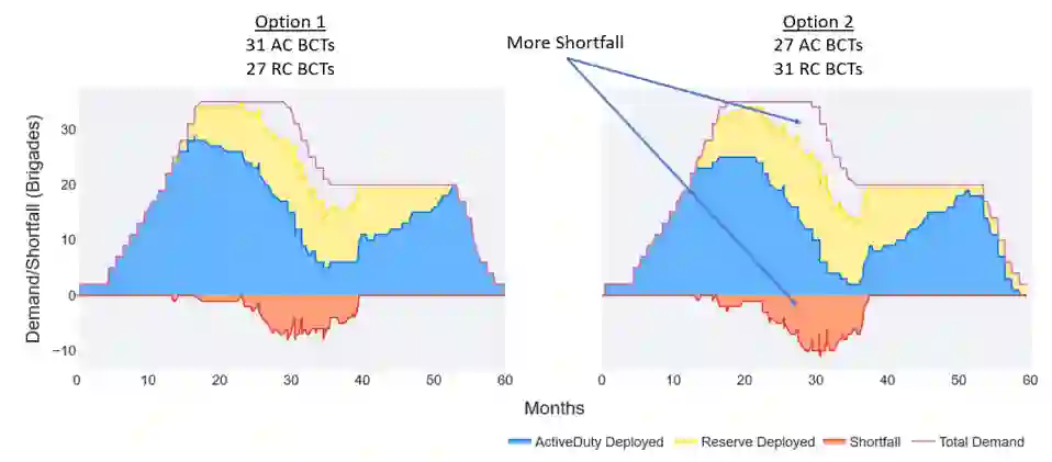 作为一个例子,我们考虑了前面所示的 60 个月名义需求概况和 58 个 BCT 的部队组合。基线组合为 31 个 AC 和 27 个 RC 陆军 BCT,用户有兴趣评估将其改为 27 个 AC 和 31 个 RC BCT 的 RC 重型组合。下图和表格显示了模型输出结果,显示了在上述每种条件下部队满足用户指定需求的能力。