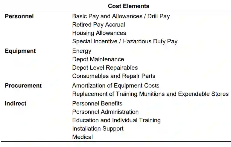 在部队组建周期的不同阶段(如重置、训练、准备、部署),根据具体单元列出了 AC 和 RC 单元的成本。模型中包含的单元成本来自各处模型和国防部数据源,包括直接成本和间接成本。下表重点介绍了四个类别的成本: 人员、设备、采购和间接成本。