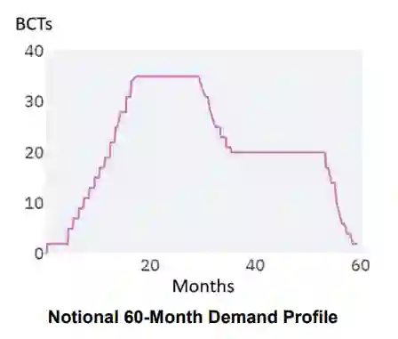 在第一阶段模型中,用户提供的需求情景包括在用户指定的时间段内所需的 BCT 数量。可存储的需求概况数量不受限制,因此用户可以根据多个需求情景测试多个政策备选方案。下图显示了一个长期战争类型情景的名义需求曲线。