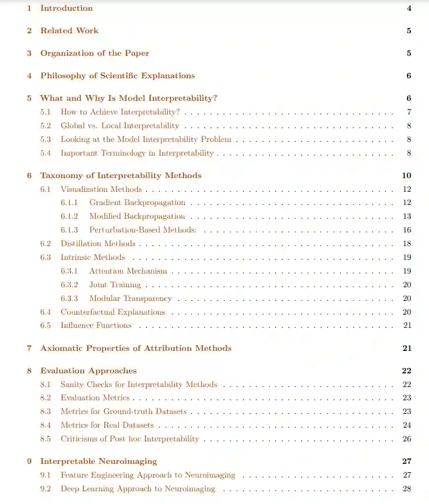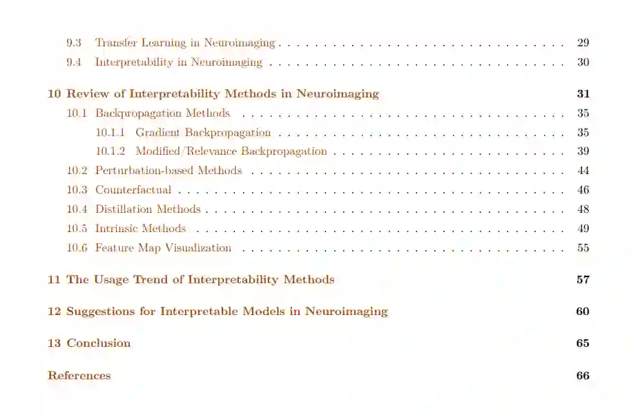 在这篇综述文章中,我们为神经影像学研究提供了一个关于深度学习模型可解释性的全面回顾。我们阐述了解释问题的哲学基础、维度和要求,并总结了为实现可靠的模型解释性而常用的方法和指标。接着,我们讨论了深度学习方法在神经影像学中的最新发展,并展示了一些关于如何应用各种解释性概念进行新发现的鼓舞人心的示例。我们通过提供一套我们认为将对未来从业者有用的指导和警告来补充这一讨论。 在第4节,我们讨论了科学解释的哲学观点。然后,在第5节中,我们从一个整体的角度介绍了AI模型的可解释性问题。在第6节,我们提供了一个有用的解释性方法的分类,并展示了使用这些方法的几个示例性的神经影像学研究。我们还简要介绍了所有主要的解释性方法的分支和每个分支中所有主要方法背后的直觉。在第7节,我们讨论了AI中解释性的期望和解释性方法需要满足的公理。在第8节,我们描述了常见的合理性测试,以证明事后解释的初步验证。我们还累积了解释性文献中提出的正式评估指标,为合成和真实数据集生成的解释提供定量验证。在考虑使用事后方法时,我们还用之前的研究中谈到的警告来补充这一部分。在第9节,我们讨论了神经影像学的深度学习方法以及这些研究中解释性的重要性。我们首先在第9.1节讨论了传统的特征工程方法,然后在第9.2节,我们转向讨论深度学习方法在神经影像学研究中的潜力。对于深度学习方法,我们强调了迁移学习(第9.3节)和解释性(第9.4节)的需要,以支持这些发现在临床和神经科学上都是有价值的。在第10节,我们详细回顾了使用图2中描述的所有主要解释性方法的最新神经影像学研究。我们展示了一些示例性的例子,说明最近的神经影像学研究如何使用解释性的想法来发现新的神经精神病生物标记物。在第11节,我们调查了在超过300项神经影像学研究中解释性方法的使用趋势。然后,基于本综述的总体发现,在第12节中,我们为神经影像学中的未来解释性实践提出了有用的建议和警告。我们最后在第13节讨论了我们的结论性意见。