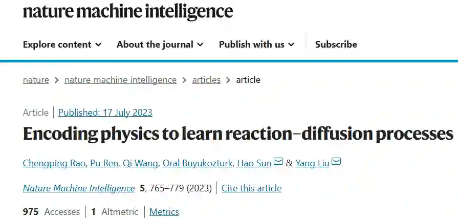 编辑 | 绿萝时空动力学(Spatiotemporal dynamics)在自然界中无处不在。比如,反应扩散过程表现出有趣的现象,在化学、生物学、地质学、物理学和生态学等许多学科中都很常见。 对复杂的时空动力学系统进行建模,在很大程度上依赖于找到潜在的偏微分方程(PDE)。然而,由于先验知识不足且缺乏用于描述系统变量非线性过程的explicit PDE 公式,在许多情况下预测这些系统的演化仍然是一项具有挑战性的任务。在此,中国科学院大学、中国人民大学、东北大学(美国)和 MIT 的研究团队,提出了一种新的深度学习框架——PeRCNN,该框架在循环卷积神经网络中强制编码给定的物理结构,来促进稀疏数据体系中时空动力学的学习。通过大量的数值实验展示了所提出的方法如何应用于有关反应扩散过程和其他 PDE 系统的各种问题,包括正向和逆向分析、数据驱动建模和 PDE 的发现。研究发现该物理编码机器学习方法表现出高精度、稳健性、可解释性和泛化性。该研究以「Encoding physics to learn reaction–diffusion processes」为题,于 2023 年 7 月 17 日发布在《Nature Machine Intelligence》上。