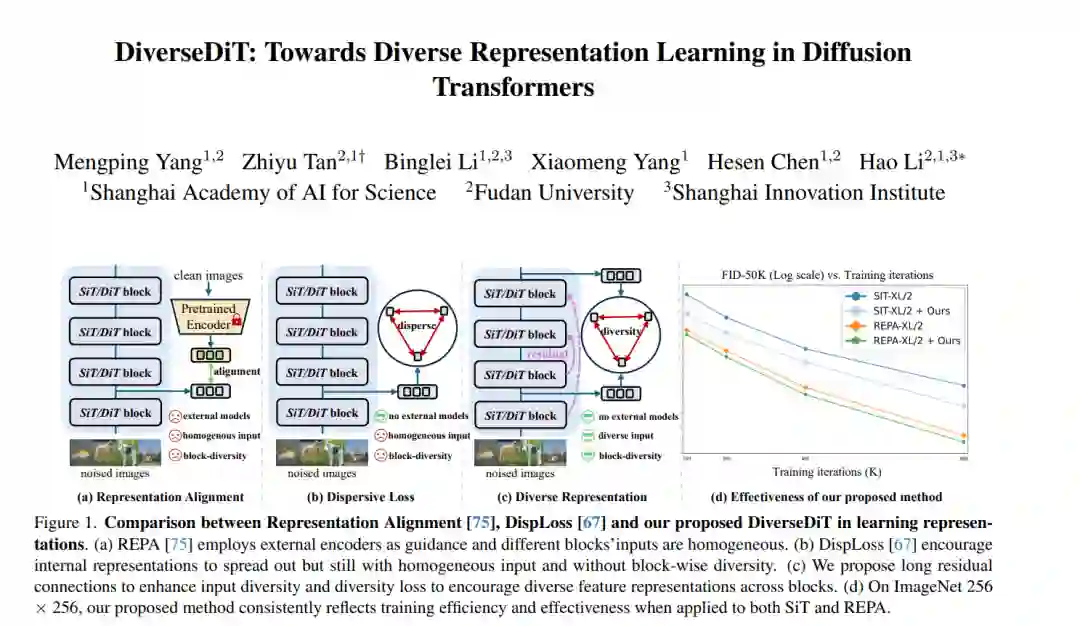 扩散 Transformer (DiTs) 近期凭借其卓越的可扩展性 (scalability),在视觉合成领域引发了变革性突破。为了增强 DiTs 捕获深层内部表征的能力,诸如 REPA 等近期的研究引入了外部预训练编码器以进行表示对齐 (representation alignment)。然而,支配 DiTs 内部表示学习的底层机制仍未得到充分探索。为此,本文首先对 DiTs 的表示动力学 (representation dynamics) 进行了系统性研究。通过分析不同设置下内部表征的演变及其影响,我们发现跨块的表示多样性 (representation diversity) 是实现高效学习的核心要素。基于这一关键洞察,我们提出了 DiverseDiT —— 一个旨在显式提升表示多样性的创新框架。DiverseDiT 通过引入长残差连接 (long residual connections) 来丰富跨块的输入表示多样性,并利用表示多样性损失函数促使各模块学习差异化特征。在 ImageNet 256×256 及 512×512 规模上的大量实验表明,DiverseDiT 在不同规模的骨干网络上均实现了稳健的性能提升与收敛加速,即便在极具挑战性的单步生成 (one-step generation) 场景下亦表现出色。此外,我们证明了 DiverseDiT 与现有的表示学习技术具有良好的互补性,能够进一步提升模型性能。本研究为理解 DiTs 的表示学习动力学提供了重要见解,并为增强模型效能提供了一种切实可行的方案。项目代码已开源至:https://github.com/kobeshegu/DiverseDiT。