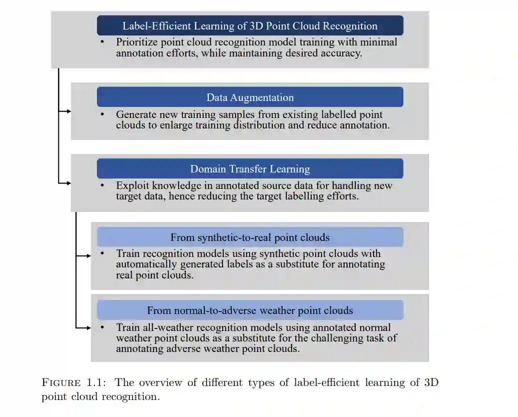 点云是三维(3D)点的集合,准确地描述了物体或环境的形状和几何形状。这种性质使它们高度适用于各种3D识别任务,包括3D形状分析、3D目标检测和3D语义分割。近年来,点云数据的三维采集技术得到了快速发展,各种三维传感器在工业和日常生活中的应用越来越广泛。例子包括自动驾驶汽车中的激光雷达传感器,Kinect和苹果产品等设备中的RGB-D相机,以及在各种重建任务中使用的3D扫描仪。同时,深度学习的显著进步为点云识别领域做出了重要贡献,涌现了大量深度点云结构和网络。这两者的同时,见证了利用点云来捕捉物体和场景的3D形状表示的需求日益增加,从自主导航和机器人到遥感应用等。本节首先概述点云识别的进展,强调对相关任务进行标签高效学习的必要性。回顾了标记高效点云学习的最新进展,重点关注三种关键类型的标记高效学习方法,这些方法大大减少了对大量人工标注工作的需要。这些方法包括数据增强、从合成点云到真实点云的域迁移学习,以及从正常天气点云到不利天气点云的域迁移学习。每一种方法都是根据其特定的数据前提条件以及在训练鲁棒点云识别网络时减轻人工标注负担的能力进行探索的。由于点云的非结构化和无序性,与二维视觉中的图像识别相比,三维点云识别的深度学习具有独特的挑战,标准的卷积神经网络无法直接应用于点云处理。PointNet[8]的出现,利用多层感知器(MLPs),彻底改变了广泛任务中的点云识别,如目标分类、部分分割和场景语义解析。此后,各种深度神经网络架构,如图神经网络[9]和稀疏卷积网络[10],在3D形状分类、3D目标检测、3D语义分割等各类点云识别任务中取得了显著进展。尽管深度学习在点云识别方面取得了显著进展,但大多数现有研究严重依赖大规模、精确标注的3D数据进行网络训练。尽管大量训练点云的收集已经变得更容易被接受,但由于数据的高度复杂性、点稀疏性的显著变化、注释过程中存在丰富的噪声、遮挡和频繁的3D视图变化,注释过程仍然是众所周知的费力和耗时。点云标注的劳动密集型特性使得构建大规模点云数据集极其昂贵和耗时。这直接导致现有公共点云数据集的规模和多样性有限,给开发跨各种应用的通用点云学习算法带来了巨大挑战。为了解决与点云注释相关的负担,一个有希望的解决方案是标签高效学习——一种机器学习范式,以最少的注释优先进行模型训练,同时仍然实现所需的精度。标记高效的点云学习由于其重要性和较高的实用价值,近年来成为一个蓬勃发展的研究领域。各种标签高效学习方法被研究,每种方法都有自己的数据需求和应用场景。本文研究了三种代表性的标记高效学习形式,即数据增强、从合成点云到真实点云的域迁移学习,以及从正常天气到不利天气点云的域迁移学习。1)数据增强涉及从现有样本生成新的训练数据,以增强训练分布并促进网络训练。事实证明,当可用的标记训练数据有限时,这种技术特别有利。2)从合成点云到真实点云的域迁移学习涉及利用合成点云来训练识别模型。通过利用自动生成的标签,该方法利用丰富的合成数据作为标注真实点云的替代方案。3)正常到恶劣天气点云域迁移学习旨在通过对正常天气条件下收集的标记数据进行训练,建立鲁棒的点云识别模型。这是至关重要的,因为在恶劣天气中捕获的点云存在很大的几何失真和模糊性,这给标注带来了重大挑战。这三种标签高效学习技术的广泛探索,源于它们在各种3D视觉任务中的巨大潜力,包括形状分类、实例检测、语义分割等。