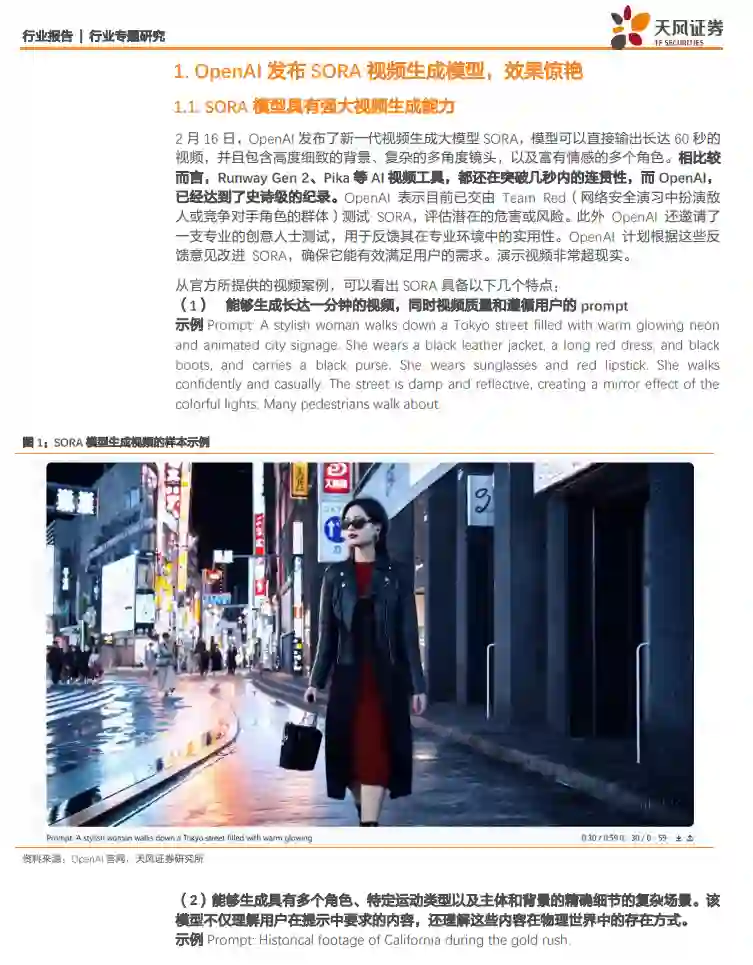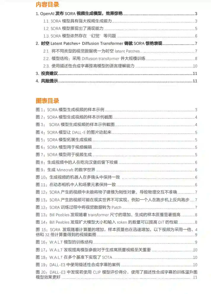 OpenAI发布了最新文生视频大模型SORA,可以生成1分钟长视频,效果显著,在生成的视频细节,内容一致性和指令遵循能力独树一帜 2月16日,OpenAI首次对外公布了SORA文生视频模型,SORA模型可以直接输出长达60秒的视频,并且包含高度细致的背景、复杂的多角度镜头,以及富有情感的多个角色。相比较而言,Runway Gen2、Pika等AI视频工具,都还在突破几秒内的连贯性,而OpenAI,已经达到了史诗级的纪录。OpenAI目前已经邀请了一支专业的创意人士测试,用于反馈其在专业环境中的实用性。 SORA模型在训练中将不同类型视觉素材统一为时空Latent Patch,采用Diffusion-transformer结构并大规模训练,再次展现“暴力美学” 从technical report窥探技术路径,OpenAI在文生视频领域再次展现“暴力美学”,SORA在模型结构上使用了Diffusion Transformer结构,采用了大规模的训练,在数据上将图片和视频统一压缩转换为时空Latent Patches并作为transformer输入,而这一步也使得模型能够在不同分辨率、持续时间和宽高比的视频/图像数据上进行训练,同时为了提高模型的理解能力,SORA使用了DALL-E3模型中的re-captioning技术,训练了一个caption模型为视频数据生成文字字幕。 SORA模型已具备了一定的涌现能力,虽然也存在“幻觉问题”,但我们认为文生视频的GPT-3时刻已来 SORA模型现在可用于视频生成,图片生成,视频编辑、视频链接和视频前后拓展等,我们认为未来有望重塑影视/动画/自媒体等诸多视频生产行业,同时SORA还展现出了一定的涌现能力,使其能够从物理世界模拟人、动物和环境的某些方面,包括3D连续,物体持续和long-range的连贯性,我们预计未来SORA也会逐步进化,如同GPT3到4一样有更强的能力,或许文生视频的GPT-3时刻已经到来。