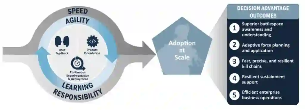 生成式AI的预期应用包括"智能决策支持系统(IDSS)与辅助目标识别(AiTC)"——协助战场决策、目标辨识及伤员救护;其核心目标在于减轻操作员认知负荷并提升高危环境决策精度。历史上,美军已在"自主无人机武器/智能巡航导弹"中应用AI,并在"复杂高风险环境验证显著成效与可靠成果"。尽管这些武器系统的AI未必依赖生成式模型,但彰显出遵循美国治理伦理基础原则的潜力。图1展示国防部AI融入新型作战任务的流程体系,该系统将取代传统实践以培育数据驱动的现代化军队。