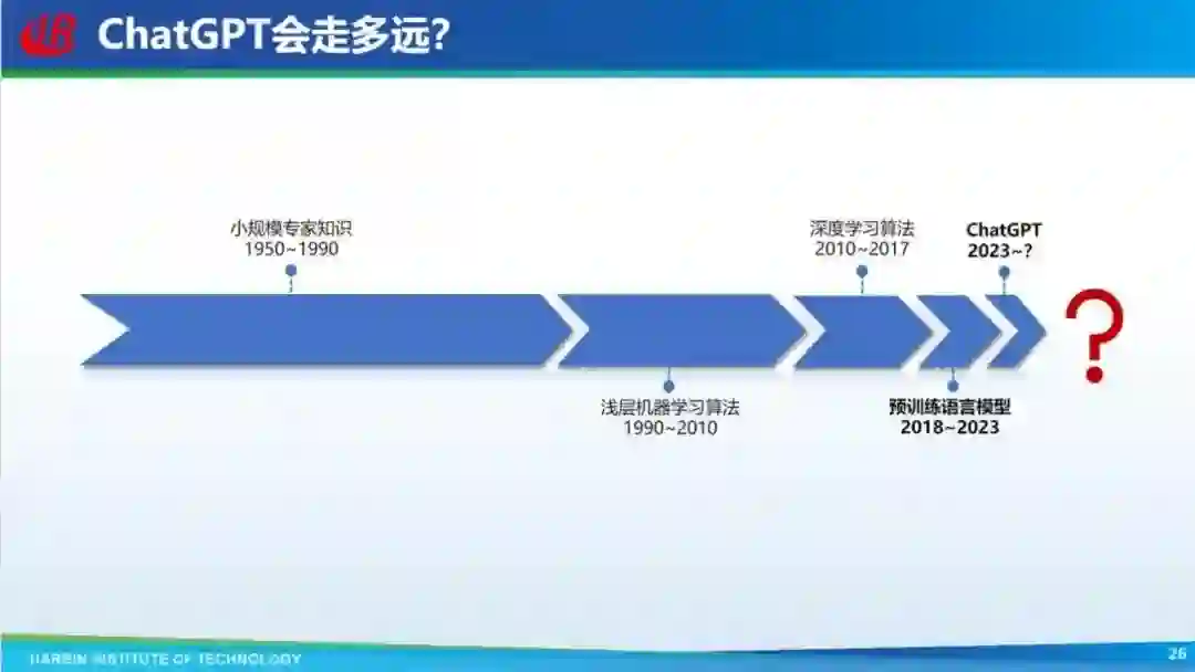 ChatGPT 到底还会走多远,我还以之前的趋势图进行介绍。从图中可以看到,一个技术范式的历程大概是上一个历程的一半。比如前面基于专家知识做了四十年,浅层机器学习算法做了二十年,深度学习做了十年,预训练模型做了五年,那么 ChatGPT 还能做多少年?根据现有的趋势推测可能 2.5 年,也就是到 2025 年可能又要更新换代了。但是这么发展下去会什么样? 有人会说这个预测不对,如果按这个预测来讲,可能到某一天技术就停止进步了。我认为也可能会出现这种情况,因为随着人工智能的发展,可能会威胁到人类,一旦人工智能威胁到人类生存之后,有可能会被立法禁止人工智能技术的进步。