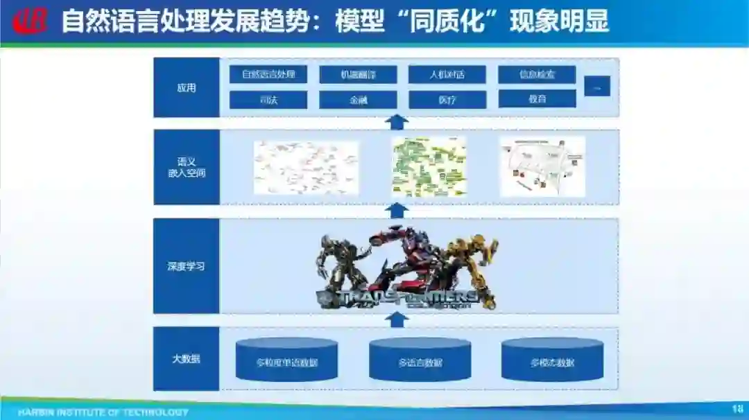 学术界面临的困难会越来越大,因为我们没有那么多数据,没有那么多计算资源。当然也不是说学术界就无事可做了,以后怎么办呢?可能还是要往下走,但是再往下走又面临选择,你是不是沿着大模型的路往下走,学术界有人认为这不是很好的路线。 不仅是自然语言处理,从人工智能发展的过程来讲,其实能看到两个明显的趋势: 一是模型同质化现象越来越严重。原来要根据不同任务、不同领域,用不同模型,现在统一使用 Transformer,我觉得这个趋势没法逆转,即使出来 Transformer 替代品,但它一定是一个同质化的模型。
