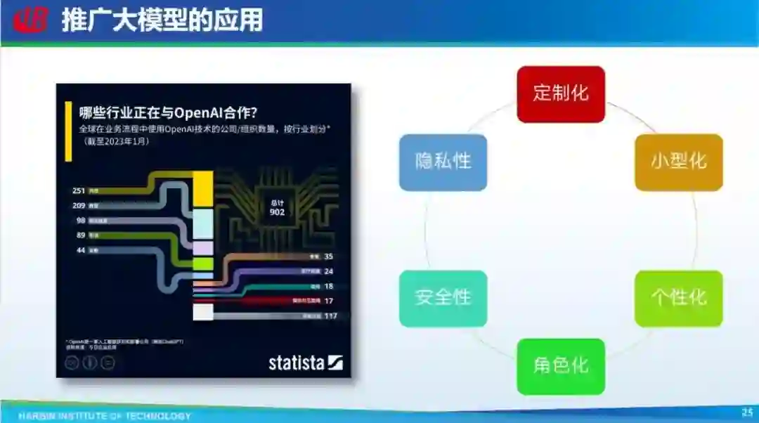 最后要推广大模型的应用。ChatGPT 是一种通用模型,怎么把它落地到各行各业,包括怎么做定制化、小型化、个性化,甚至角色化、安全性、隐私性等等,这些都是需要考虑和解决的问题。
