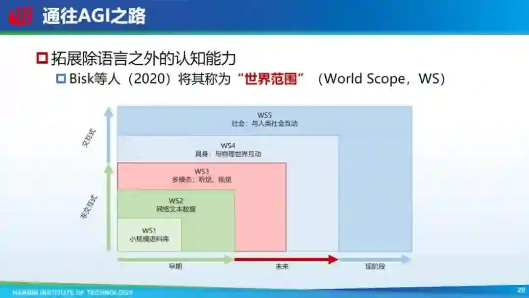 当然,只从文本入手没法解决这个问题,还是要往多模态等发展。结合更多的模态,通往真正的 AGI。 之前有学者把机器能够利用的数据范围划为五个,从最简单的小规模文本一直到和人类社会互动这五个范围。之前很长一段时间大家都只用文本端,现阶段等于是跨过中间的两个(多模态和具身),直接到了和人类社会的互动,因为现在 ChatGPT 就是和人类社会交互。在交互过程中,人也在教机器怎么说语言,怎么理解语言。但跨过中间两段不代表就真的包含这两段,还是要把这两段补齐。现在 GPT-4 补齐了多模态,Google、微软等也在做具身方面的研究。