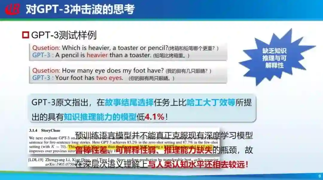 GPT-3 的出现并没有引起大家的特别关注,为什么呢?因为当时大家发现 GPT-3 虽然能够实现这些任务,但效果并不是很好。举几个典型的例子,比如问 GPT-3「烤箱和铅笔哪个重」,它会说「铅笔比较重」;再问「我的脚上有几只眼睛」,它会说「两只眼睛」。 GPT-3 给出的答案很多是错误的,有些人就认为花这么多钱构造这么大的模型也没有解决根本任务。当然 GPT-3 原文也指出,在故事结尾选择任务上比我们组丁效老师等所提出的具有知识推理能力的模型低 4.1%。因此大家认为这种大模型鲁棒性差、可解释性弱、推理能力也不强,因此需要有更多的知识。