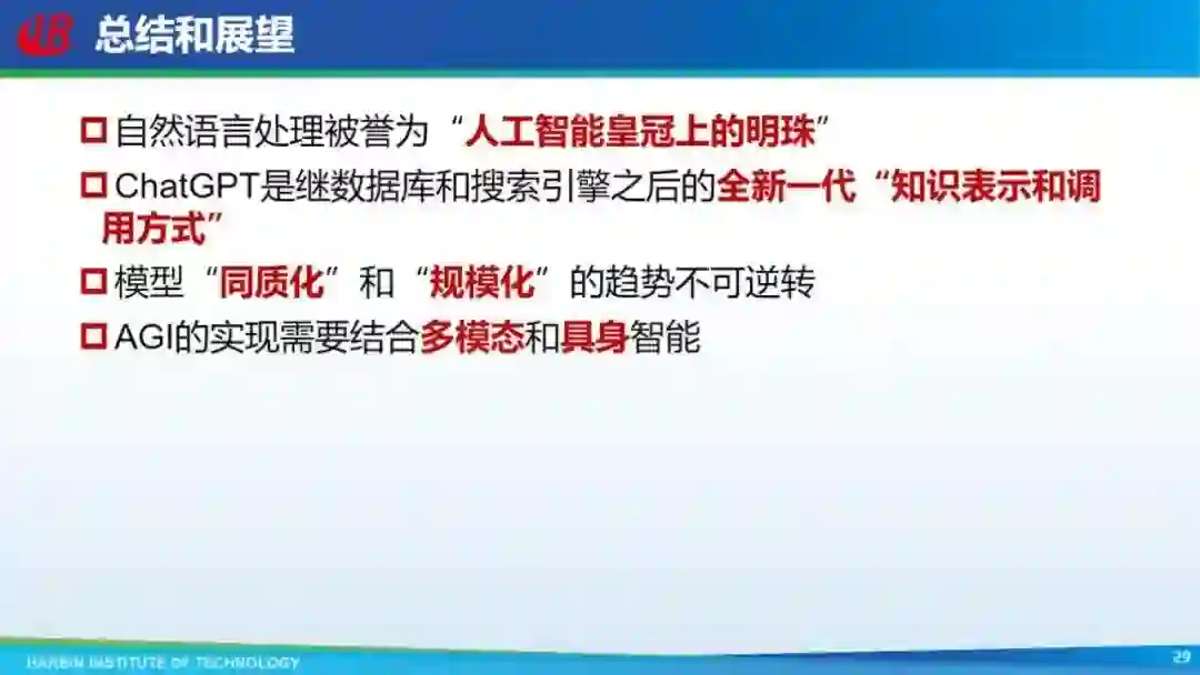 最后是总结和展望,自然语言处理是人工智能皇冠上的明珠,ChatGPT 是继数据库和搜索引擎之后的全新一代知识表示和调用方式,模型同质化和规模化的趋势不可逆转。要想真正实现 AGI,需要结合多模态和具身智能。