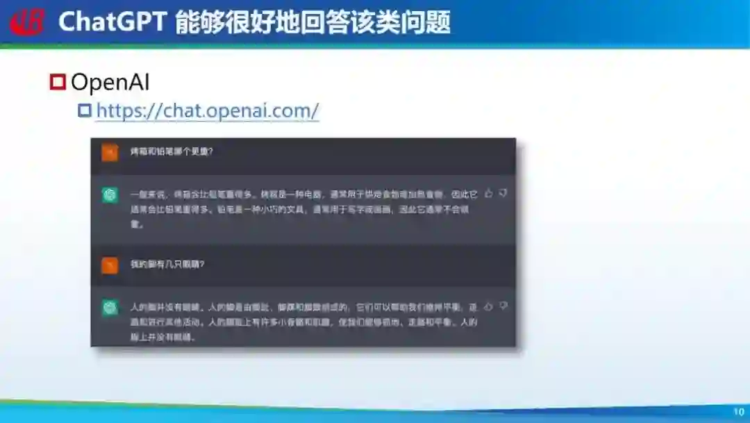 第一条路:既然模型缺知识、缺推理能力、缺可解释性,就需要针对这些任务进行专门优化。我们能不能加知识,比如往里面加知识图谱,专门做可解释性?这是一条路。 第二条路:以 OpenAI 为代表,不是针对特定任务解决,而是不停的往里面加数据,有多少人工就有多少数据,就像现在 ChatGPT 的路线,不停的往里面加数据,甚至是加人工标注的数据。 现在看来,这种加知识图谱的方法好像确实没有特别明显的进步,反倒是大力出奇迹的方法取得更好的进展。比如还是问刚才那两个问题,ChatGPT 就会说「烤箱更重」,而且会给出一个解释;问「脚上几只眼」,它也会否定说「脚上没有眼」,同时给出解释。可以说很好的解决了这个问题。