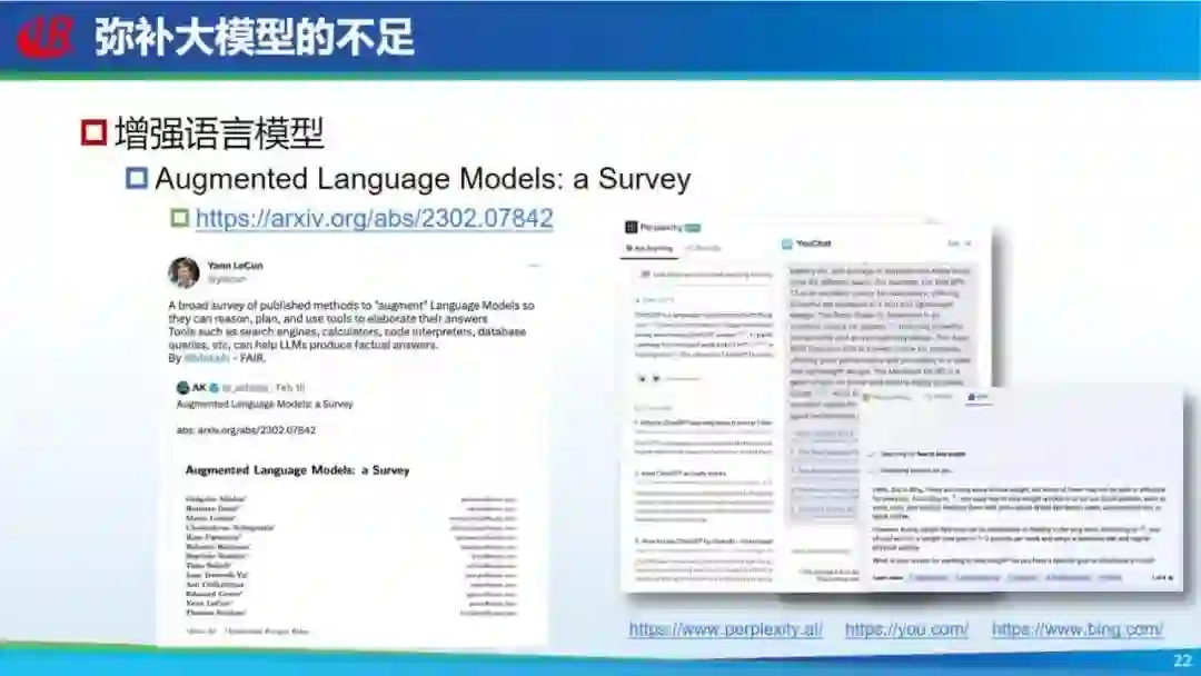 但是怎么弥补呢?可以用增强的方法,图灵奖得主 Yann LeCun 发表过一篇文章就总结过这种方法,包括加上搜索引擎、知识库、外挂工具等,这些都可以叫增强。除此之外,目前也有很多工作使用搜索引擎来弥补现在 ChatGPT 的不足。