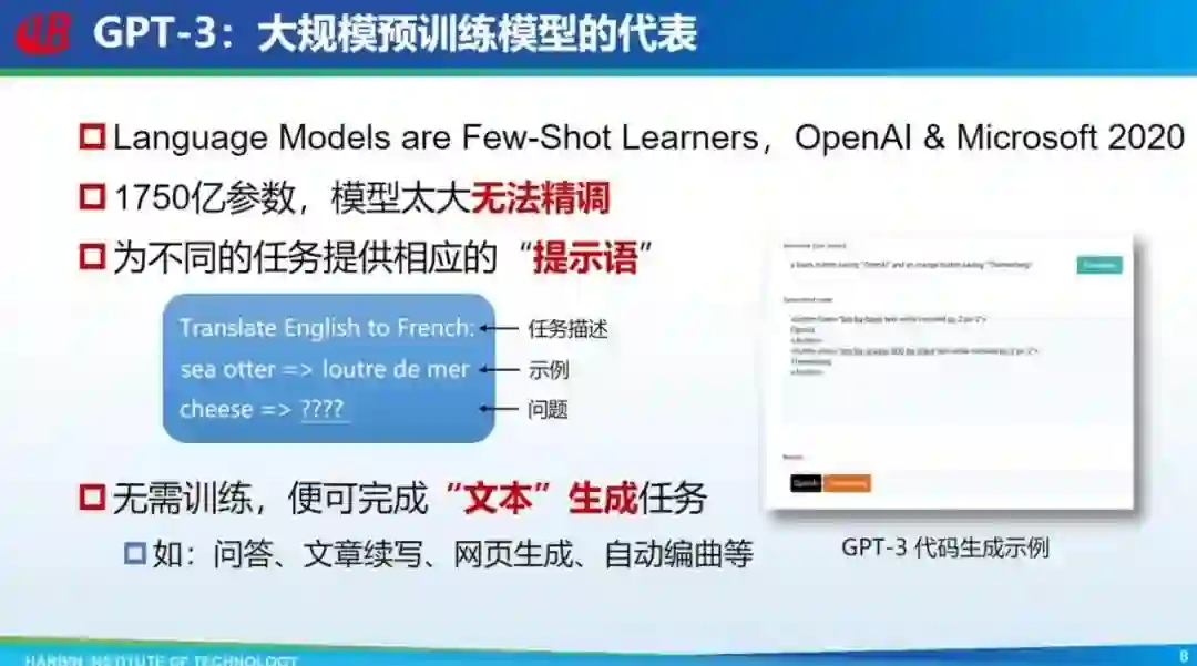 在预训练模型阶段比较有代表性的研究是 GPT-3,它是 OpenAI 和微软在 2020 年发布的大模型,参数量达 1750 亿,以当时的视角来看,研究者认为这个模型太大没办法精调,所以「提示语」方法出现了。所谓提示语,即直接给出任务描述,可以让模型自动补全这个任务,这个补全过程就是在完成任务,如果再给出一些示例,模型性能可能会更好,这种也叫做情境学习。采用这种方式的一个好处是模型无需针对某一个任务再次训练,就可以完成不同文本生成任务。当然,这个文本生成任务是加引号的,因为它不仅能回答问题、文章续写,还可以完成生成网页,甚至生成代码等范文本任务。