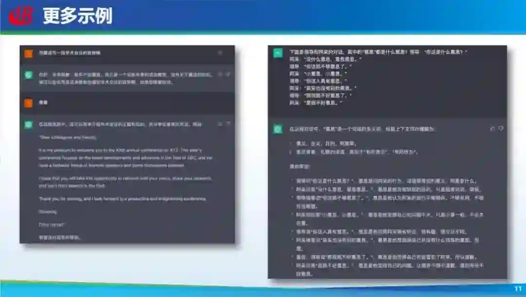 当然还有其他示例,比如让 ChatGPT 用藏语写学术会议致辞,它首先会否定,说自己不会。这是很厉害的,原来我们做问答和聊天模型很难否定一个问题。另外,它说会用英语写,如果我说可以,它就真的会用英语写。可见 ChatGPT 对会的语言掌握的很好。 还是前面那个例子,「领导和阿呆的对话」直接问 ChatGPT 这到底是什么意思,它会回答说有两个意思,具体每一句话的意思是什么,模型都解释的很清楚。这是非常惊艳的,仔细看未必准确,但模型至少理解了这个问题,这是很难做到的。