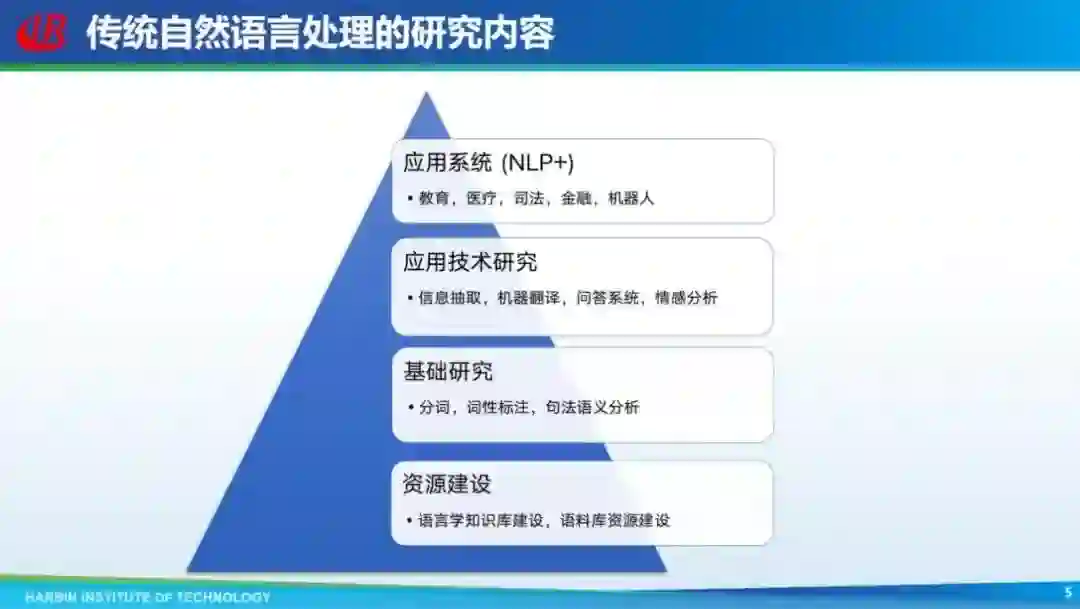 传统的自然语言处理可分为四个方向:底层的资源建设;中间层的基础研究,包括分词、词性标注等;接着是应用技术研究,包括信息抽取、机器翻译、问答系统等;再往上是应用系统,包括教育、医疗等。 但为什么说是传统自然语言处理呢?这两个字是在三个月前加上的,首先是很多基础研究任务,如分词、词性标注等已经蕴涵在大模型中了,所以这些基础任务就没有存在的必要。其次,ChatGPT 不是针对一个模型或者一个单独任务去做,它把所有应用任务统一起来进行,所以传统的按照任务划分的方式会受到挑战。因此,对于整个自然语言处理来讲可能需要重新洗牌。