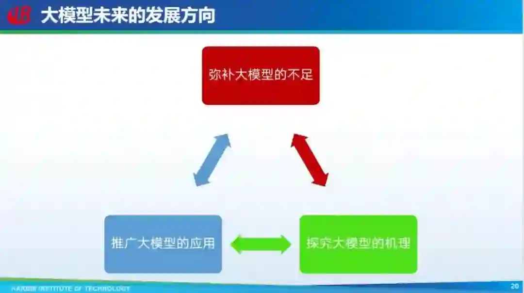 1、弥补大模型的不足,查缺补漏,发现模型哪里做的不好就去弥补它;2、探究大模型的机理,现在很多任务都停留在实验阶段,至于模型背后为什么产生这样的效果我们也不了解,我们要知道背后的机理;3、推广大模型的应用。