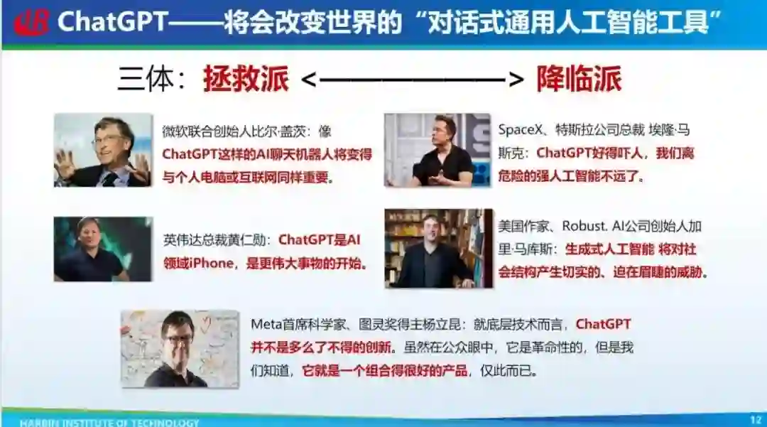 所以 ChatGPT 到底是什么?其实这个名字有一点误导,说到 Chat 很多人就会想到聊天系统,其实它本质上不是一个聊天系统,它只是伪装成聊天,本质上是「对话式通用人工智能工具」。当然有了这样强大的工具之后,不同的学者有不同的观点,像比尔・盖茨、黄仁勋他们认为这个发明很伟大,类比成 PC 互联网和 iPhone 这种技术,可以造福人类;当然还有另外一派以马斯克为代表的,他们认为像 ChatGPT 这种通用人工智能的出现会威胁人类;还有一些理性派,像图灵奖得主 Yann LeCun 曾表示,就底层技术而言,ChatGPT 并不是多么了不得的创新,他表示虽然在公众眼中,它是革命性的,但是我们知道,它就是一个组合得很好的产品,仅此而已。