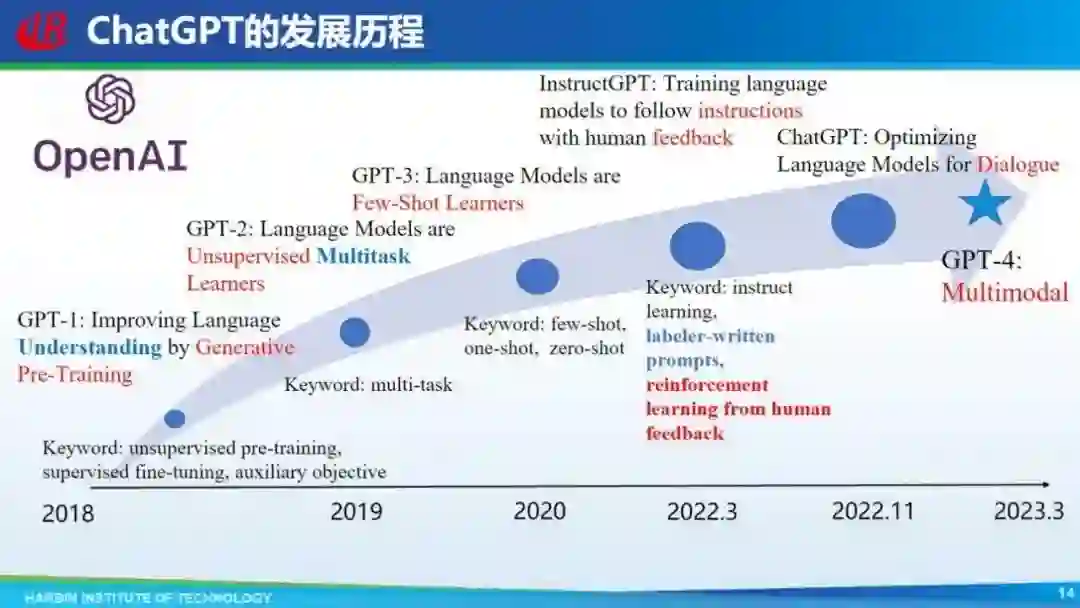 直到去年 11 月底 ChatGPT 的发布,一炮打响,引起更多关注,以及今年 3 月份发布的 GPT-4,它不光处理文本,甚至融合了多模态。OpenAI 整个历程比较励志,它一直沿着 GPT 这条路线在走,最后还走通了,有人说 OpenAI 比较犟,比较执拗,但确实它有自己的信心和理想,走成了。