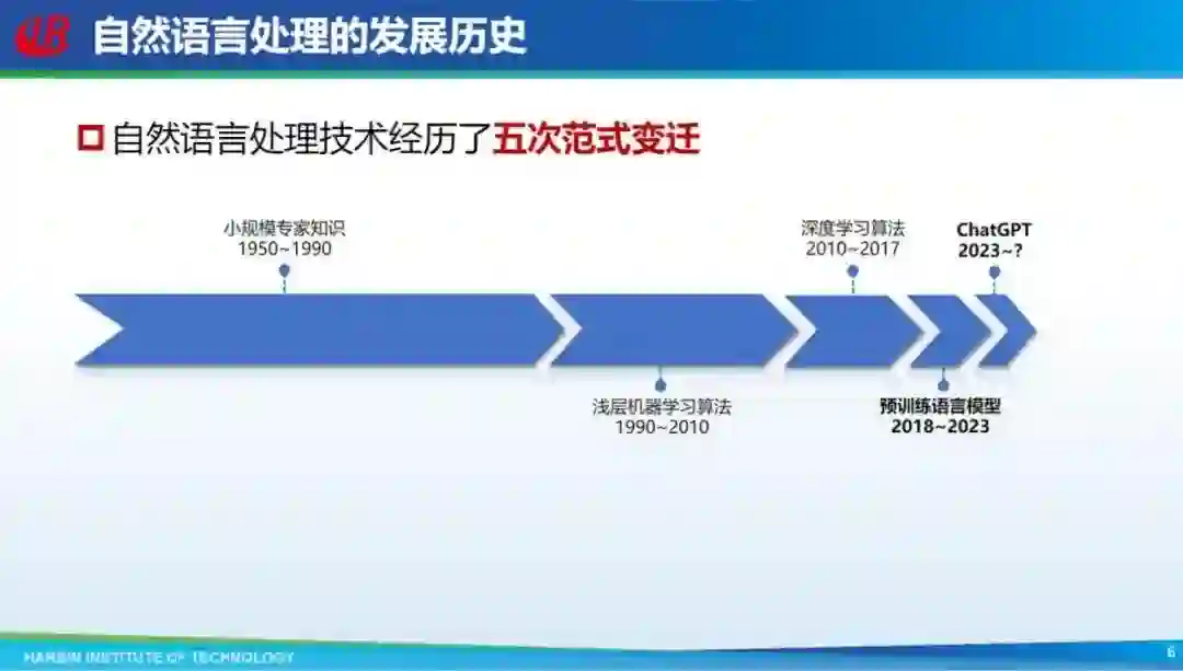 自然语言处理发展历史和人工智能发展历史几乎是同步的,从上世纪五十年代开始利用小规模专家知识;1990 年出现了浅层机器学习算法;2010 年深度学习算法;然后 2018 年以预训练模型为代表的范式出现;到 2023 年 ChatGPT 等模型的出现,一共经历五次范式变迁。