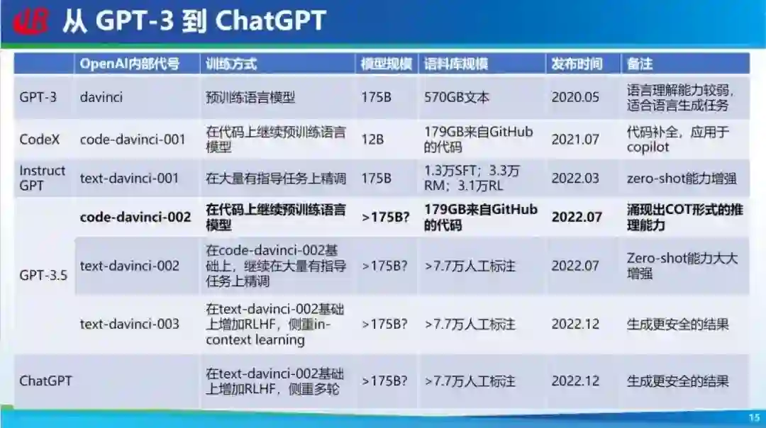 从 GPT-3 到 ChatGPT,也不是一蹴而就的,中间做了很多工作。其中比较有意思的是 CodeX 的提出,这一模型单纯的做代码预训练,进行代码补全,有了它,在代码编辑器里可以帮助我们写代码,这个工具非常好用。此时,GPT 等于分化了,一部分走语言,一部分走代码,中间 code-davinci-002 又把这两者合并了,在语言模型的基础上继续使用代码数据进行预训练,竟然产生了很好的推理效果,这是为什么呢?可能代码里面有很好的逻辑性,解决问题有顺序逻辑,甚至有远程的依赖,当然这里面有很多解释,这只是其中一种猜测,现在大家也不了解为什么 ChatGPT 出现了这么好的效果。