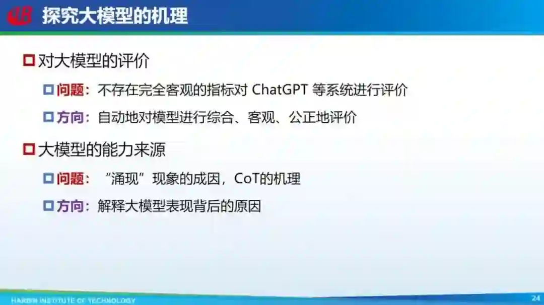 还有就是怎么对大模型进行评价。现在有很多评价模型的数据集发布,但这个数据集一旦发布就有可能泄漏,有些人会把数据集用到训练数据里,怎么解决这种问题,也是需要考虑的。 三是解释包括涌现现象、CoT 等出现的机理。
