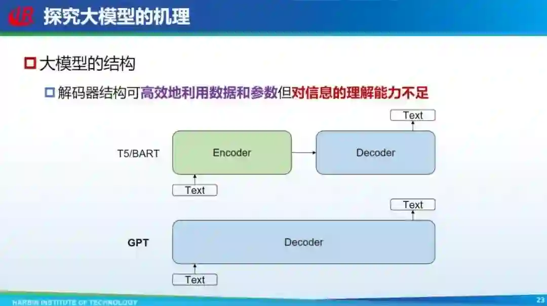 接下来是探究大模型背后的机理,现在的争议围绕到底是 Encoder-Decoder 结构好,还是 Decoder only 结构好。这些方法各有各的优缺点。Decoder only 如 GPT,其参数和数据利用率更高,但从对输入理解的角度,Encoder-Decoder 结构可能更好。这两者之间怎么平衡,或者说到底哪个好,现在也没有统一的结论,还处于探索阶段。