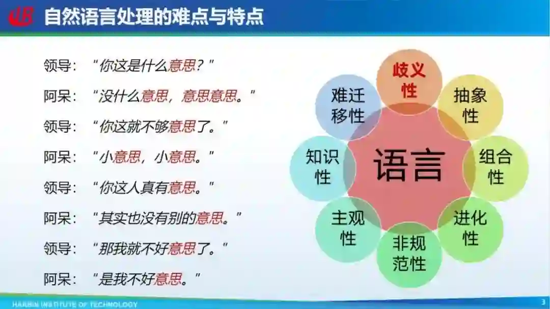 自然语言处理面临很多难点,我们举例来说,如下图所示,在这次对话中,内容包含很多「意思」,不同的「意思」代表不同的含义,这种情况属于典型的歧义性问题。除了歧义性之外,自然语言处理面临的难点还包括抽象性、组合性、进化性等。在抽象性这个问题中,我们以汽车这个词举例,它背后有非常丰富的含义,我们一说到汽车这两个字就会有很多联想;组合性也是一样,无论哪种语言,它都是由一些基本符号构成的,这些基本符号可以组合成无穷无尽的语义。