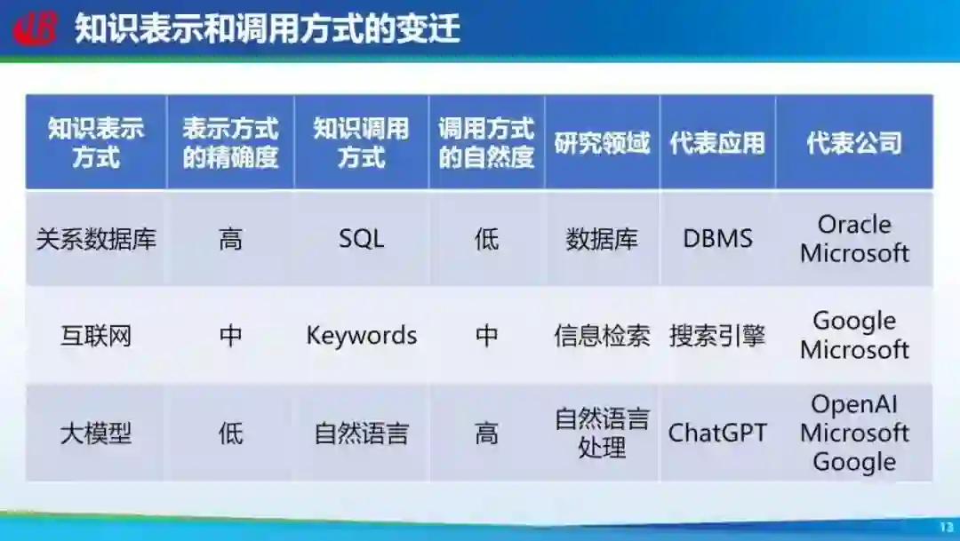 大家看到的更多的是表面现象,说它效果多么惊艳,但是一个惊艳的东西未必会引起这么大的轰动,到底背后产生了哪种变革或者真的解决了什么实质性的科学问题? 我认为主要解决的是知识的表示以及知识调用这种根本性的革命,可以说每次知识表示和调用方式的转变都会引起产业界巨大的变革。知识最早是以数据库的方式存储在计算机内部,想调用它就需要 SQL 语句等,需要人去适应机器,即使是这样的技术也产生了很多伟大的公司,如 Oracle 等。但后来大量的知识是存储在互联网里,这种知识是非结构化存储的,包括文本、图像,甚至视频等。要想调用这里面的知识,我们就不需要学 SQL 语句,只要用关键词,通过搜索引擎的方式就可以把存储在互联网中的知识调用出来。现在 ChatGPT 仍然会存互联网的知识,但是它不是以显示的方式存储,而是以参数的方式存储在大模型中。 但是 GPT-3 两年前就能完成这样的任务,为什么没有引起这么大的轰动呢?因为它没有解决好另外一部分问题,即怎样把这些知识调用出来。ChatGPT 很好的解决了这个问题,通过自然语言的方式就可以很好的把这些知识调用出来。ChatGPT 等于把这两块打通了,一旦打通之后就引起了剧烈革命,相信也会像前两次一样产生伟大的公司,现在 OpenAI 先行一步,或者说拔得头筹,但能不能笑到最后也不一定,因为现在很多公司都在积极跟进。当然还有一个比较有意思的发现,就是后面代表性的公司每个都离不开微软,每个都有微软的身影,但微软每次都不是老大,都跟在后面,这也是挺有趣的现象。