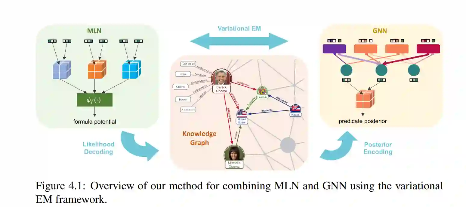 知识图谱的概率逻辑推理(第四章)。作为一个优雅而强大的工具,马尔科夫逻辑网络(MLN)成功地结合了逻辑规则和概率图模型,可以解决许多知识图的推理问题。然而,MLN推理的计算量很大,使得MLN的工业规模应用非常困难。近年来,图神经网络(GNNs)已经成为解决大规模图问题的高效工具。然而,GNN并没有明确地将先验逻辑规则纳入模型,而且可能需要许多标记的例子来完成目标任务。我们探索了MLN和GNN的结合,并将图神经网络用于MLN的变异推理。本章的内容出现在ICLR 2020的论文集中[14]。