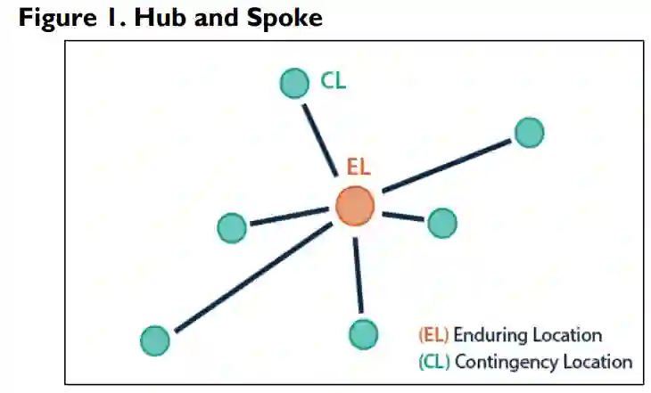 ACE 的核心思想是将单元和能力分布和分散到多个不同地点。空军条令 1-21(AFDN 1-21)--是公开发表的对 ACE 的主要基本阐述--指出,这一概念 "将行动从集中的有形基础设施转移到由较小、分散的地点组成的网络,从而使对手的计划复杂化,并为联合部队指挥官提供更多选择"。一些分析家将其描述为 "枢纽-辐条 "方法,以一个持久地点(如现有的美国或盟国空军基地)作为若干应急地点(如民用机场、简易或独立简易机场)的枢纽,飞机可在这些地点之间转移,也可从这些地点发起任务(见图 1)。