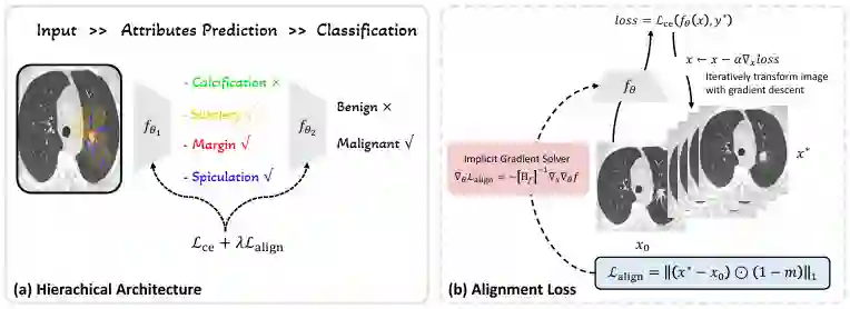 图1. (a) 采用分层结构,先预测图像属性,再输出诊断结果。(b) 训练阶段,前向传播中生成反事实图像 x*,并根据专家标注 m 计算对齐损失 Lalign;反向传播中通过隐式梯度求解器计算梯度并更新参数 θ。