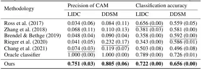 本文将所提方法与一系列具代表性的可解释性基线方法进行了对比。由图2可见,我们的方法在两个指标上均显著优于除 Oracle 外的所有基线,充分体现了其在因果特征建模方面的优势。相比于仅捕捉表面相关性的伪特征,本方法关注的区域具备真实的因果关系,因而在测试集上具有更强的泛化能力。