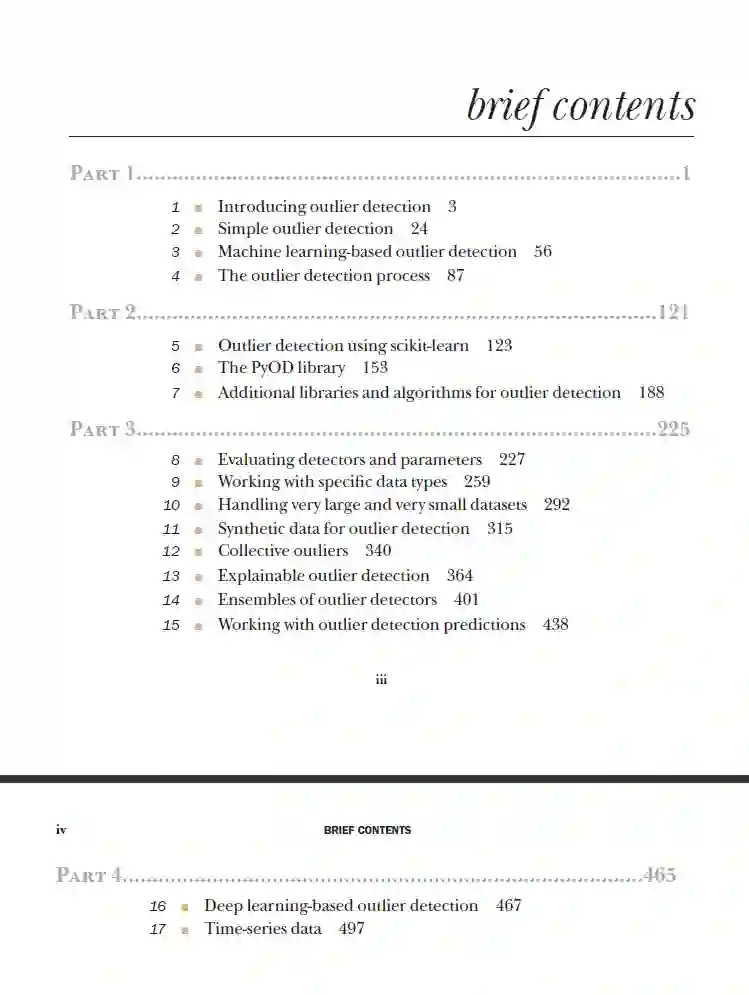 第二部分5. 使用 scikit-learn 进行异常值检测 6. PyOD 库 7. 其他异常值检测库和算法 第三部分8. 评估检测器和参数 9. 处理特定数据类型 10. 处理非常大或非常小的数据集 11. 用于异常值检测的合成数据 12. 集体异常值 13. 可解释的异常值检测 14. 异常值检测器的集成 15. 处理异常值检测预测 第四部分16. 基于深度学习的异常值检测 17. 时间序列数据 作者介绍