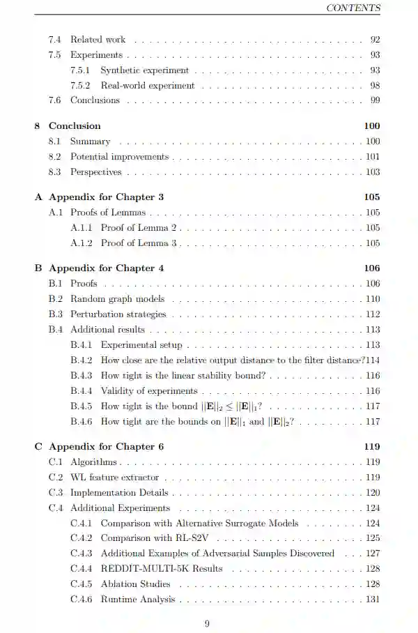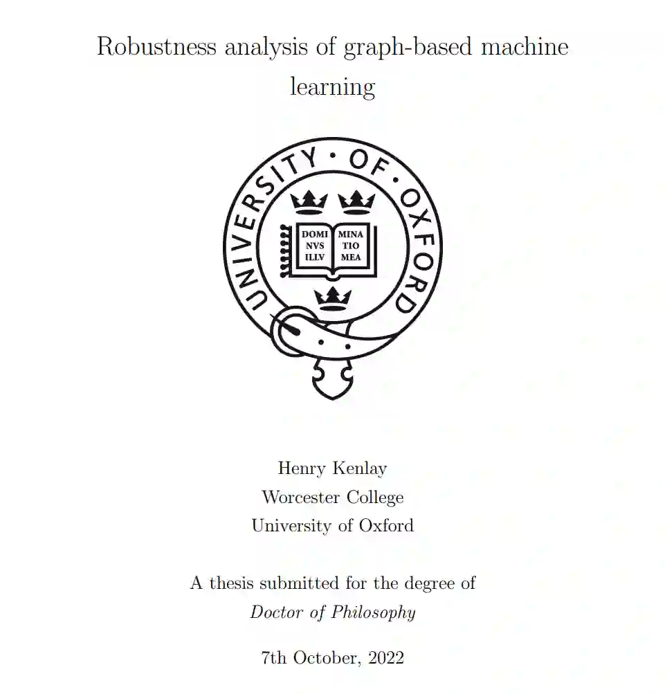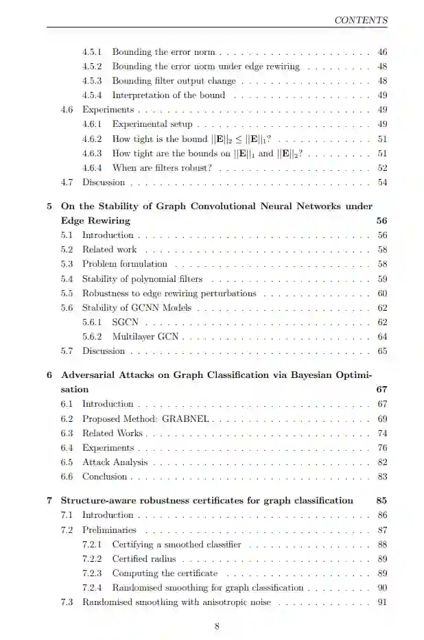 部分可观测性。有时我们拥有的图数据只部分代表图中节点之间的底层关系。例如,一个在线社交网络为我们提供了现实世界友谊的近似。这是一个近似,因为现实生活中不是朋友的人可能会在社交网络上连接,而现实生活中的朋友可能还没有在在线平台上连接。在许多情况下,我们希望学到的表示能捕捉到人们的现实世界友谊,尽管只有通过在线友谊图的部分知识。 尽管有许多动机研究基础拓扑变化的鲁棒性,但很少有研究致力于理解基于图的机器学习和图信号处理模型的这些鲁棒性属性。在这篇论文中,我们提出了五个技术章节,解决了这种理解的局限性。我们将考虑通过各种视角对许多常用模型的拓扑扰动的鲁棒性。我们将解决尚未探索但重要的挑战,即将拓扑属性与稳定性联系起来,即图的特定特征的变化如何影响鲁棒性。