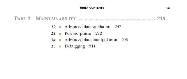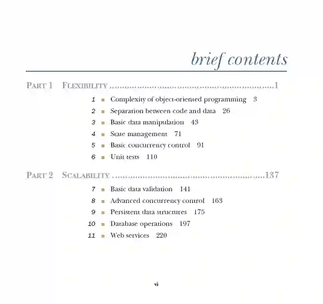 这本书讲述了一个故事,说明了面向数据编程(DOP)的价值,以及如何在现实生产系统中应用它的原则。我的建议是跟着故事走,按顺序读各个章节。然而,如果有些章节比其他章节更能激发你的好奇心,请注意,第一部分和第7部分的材料是需要理解第二和第三部分的。在本书中,我们使用Lodash (https://lodash.com/)来说明如何使用泛型函数操作数据。如果您正在阅读的代码片段使用的是您不熟悉的Lodash函数,您可以参考附录D来理解函数的行为。第1部分,灵活性,包含六个章节,重点介绍了传统面向对象编程(OOP)的挑战,并将面向数据编程(DOP)放在中心位置,揭示了如何使用DOP的基本原则来构建灵活的系统。这些章节是这样排列的: