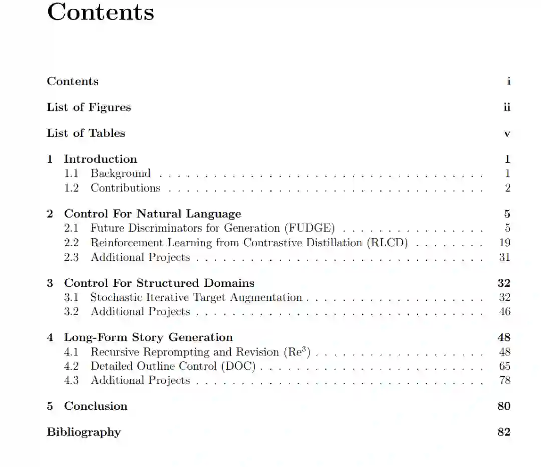 随着大型语言模型在近年来能力的大幅提升,提高我们对其输出的控制能力变得越发重要。在本论文中,我讨论了我开发的几种控制方案,范围从纯推理时控制到基于微调的对齐方法。我首先将讨论适用于非结构化自然语言生成的高度通用方法,包括一种称为FUDGE的推理时控制方案以及一种基于强化学习的微调方法,称为RLCD。接下来,我将讨论更专门的方法,这些方法可以用于更结构化领域的控制,如分子设计、程序合成和语义解析。最后,我将展示如何将这些想法与通过提示进行的结构化规划结合使用,以将我们的控制扩展到更长的输出——在自动故事生成应用中范围达到数千词。