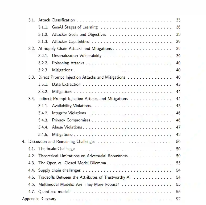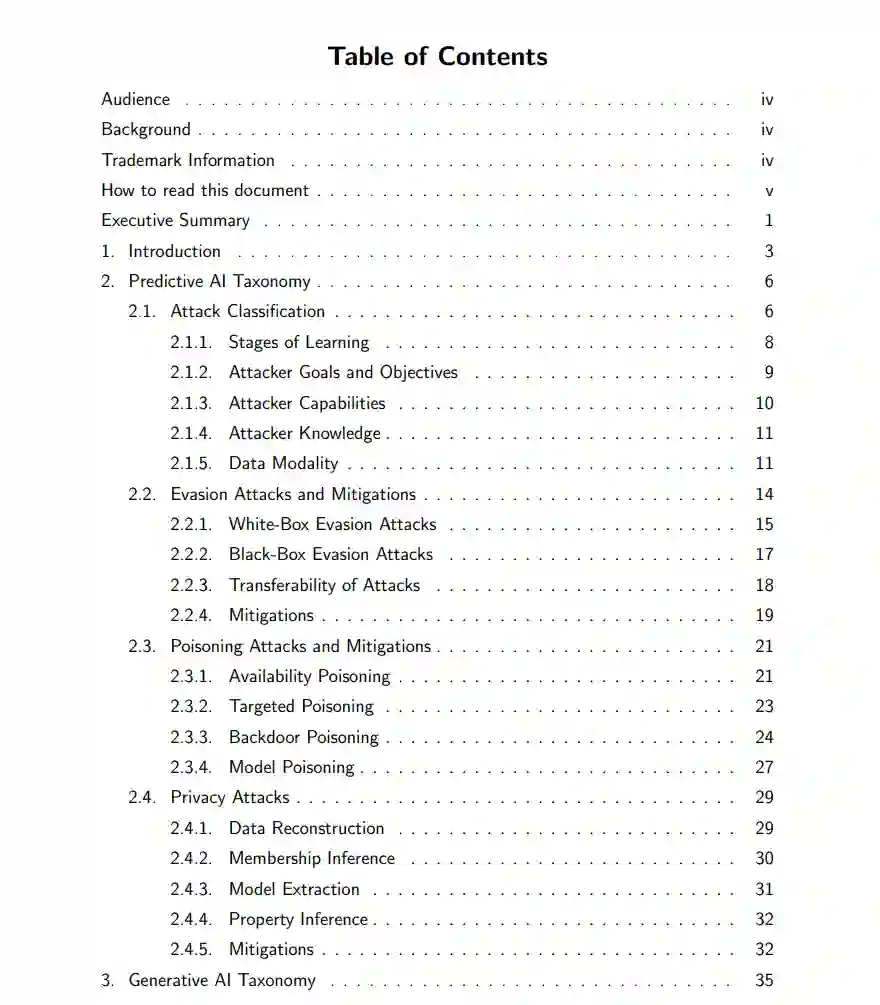 这份文档定义了一套攻击的分类体系,并在AML领域引入了术语。这个分类体系基于对AML文献的综述建立,按照概念层次排列,包括关键的ML方法类型和攻击的生命周期阶段、攻击者的目标和目的、以及攻击者对学习过程的能力和知识。报告还提供了相应的方法来减轻和管理攻击的后果,并指出了在人工智能系统的生命周期中需要考虑的相关开放性挑战。报告中使用的术语与AML文献保持一致,并由一个词汇表补充,该词汇表定义了与人工智能系统安全性相关的关键术语,旨在帮助非专家读者理解。综合来看,这个分类体系和术语旨在为评估和管理人工智能系统的安全性的其他标准和未来的实践指南提供信息,通过建立一个共同的语言和对迅速发展的AML领域的理解。与分类体系一样,术语和定义并非旨在全面,而是为了帮助理解在AML文献中出现的关键概念。