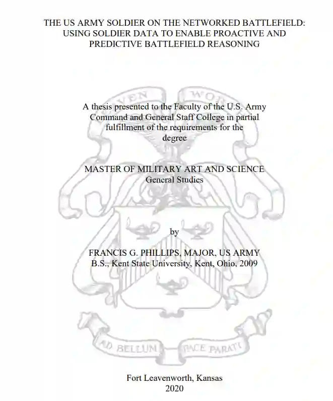 这项研究的目的是为步兵旅战斗队(IBCT)提出解决方案,以加快战场决策,并在多域战场上保持战术超配。本研究将确定如何通过收集基于士兵的数据,到 2030 年在地面战术层面实现主动和预测性战场推理(PPBR)。作者假设,美国陆军应通过融合人体可穿戴传感器和设备、机器学习软件以及美国陆军的各种举措来利用士兵数据,以便到 2030 年实现 PPBR。对美国陆军新兴概念和能力需求以及预计的未来作战环境(FOE)的分析为研究结果提供了依据。战术解决方案旨在最大限度地发挥人的潜能,并通过人机协同在单兵层面加速认知。虽然有证据表明美国陆军可以做到这一点,但对这一课题的坦率分析却引出了一个问题: 美国陆军是否应致力于全面主导信息空间,以加速战场决策,实现战术超配。多域作战中的美国陆军强调信息空间,其意义与主要机动域几乎相当。对工业和军事现代化趋势的定性元综合显示,信息曾是国家权力的一种独立工具,但在未来的网络化战场上,它将成为首选工具。基于士兵的数据是网络化信息空间的关键组成部分,指挥官应利用这些数据保持单元内部的行动自由。机动单元在数据驱动下做出明智决策的速度,将是在网络战场上实现战术超越的决定性因素。与利用士兵数据和其他数据类型实现 PPBR 的超自动化决策相比,卓越的直接火力武器系统可能很快就会黯然失色。对于战士技能 1 级任务来说,采用这一概念并非难事: 射击、移动、通信、维持、生存和信息。采用人机协作的方式来综合士兵信息,将使指挥官能够提高决策速度和态势感知能力,并积极主动地缓解战场态势。积极主动的预测性战场推理,其基础扎根于士兵内部数据的收集,将使美国陆军能够准确预测其作战范围。就像今天的汽车传感器会告知驾驶员诊断问题或剩余里程一样,士兵佩戴的联网传感器套件也将简化曾经需要宝贵时间和注意力的战场任务。世界上的大国竞争者有可能正在军事领域下一场革命的边缘徘徊:超自动化战场决策。美国陆军有可能在中期实现这场革命。