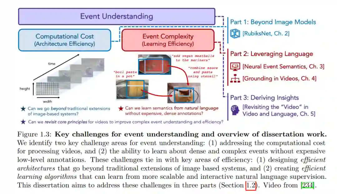 视觉世界为我们提供了一个丰富多样的有趣事件:人与物的互动、动态的视觉关系以及日常生活活动。理解它们对于发展真实世界中的交互式AI系统至关重要。然而,像人类那样从连续和高容量的感觉流中有效、高效地理解这些事件仍然是一个艰巨的任务。主要的挑战有两个方面。首先,视频在处理上是计算上的昂贵的;我们需要的不仅仅是为图像设计的系统的传统扩展。其次,视频捕捉了从低级动作基元到更高级的时空关系的广泛的事件复杂度;我们需要技术从自然语言中学习这些语义,而不需要昂贵、密集的注释。这篇论文提出了几个研究贡献,旨在应对这些挑战。首先,我们将讨论在视频中识别动作的新架构,这些架构学习如何分配固定的计算预算以提高效率和准确性,比传统技术提高了一个数量级。其次,我们将介绍新的框架,这些框架提高了我们从弱自然语言监督中高效学习密集视觉事件的能力,包括在语言结构不良或包含模糊指代的设置中。最后,我们将讨论如何利用多模态基础模型中的进展,通过一种新颖的技术揭示了更深入的时间事件理解以及提高效率的迫切挑战和机会的基本洞察。 视觉世界为我们呈现了一系列有趣的事件。如图1.1所示,我们可以观察到小规模的事件,如手势和人与物的互动(例如“将勺子放入杯子”,“调整门把手”等)。这些事件在复杂性和时间尺度上各不相同,包括更长期的日常生活活动(例如“制作美味的水果沙拉”),它们本身可能由更小的,时空重叠的事件组成。事件的范围从平凡的(例如“那里有一个苹果”)到深奥的(例如“一个苹果掉下来,打到一个物理学家的头上”)。事件可以在各种各样的环境中发生,从室内(例如“准备一餐”)到室外(例如“骑摩托车穿越丘陵道路”)。作为人类,我们经常认为理解这些事件是理所当然的[223]。我们(与许多其他生物共享的能力)处理视觉世界的原始、多模态的感知流、识别发生的明显的原子概念,并在空间和时间上关于这些概念之间的动态关系推理,以代表更高阶的意义,这无疑是非凡的。此外,这一能力,基本上是在进化的时间尺度上形成的[228],也以显著的效率和速度部署[22, 190, 45]。通过对事件的理解,我们能够有效地与视觉世界沟通、互动和学习[223]。