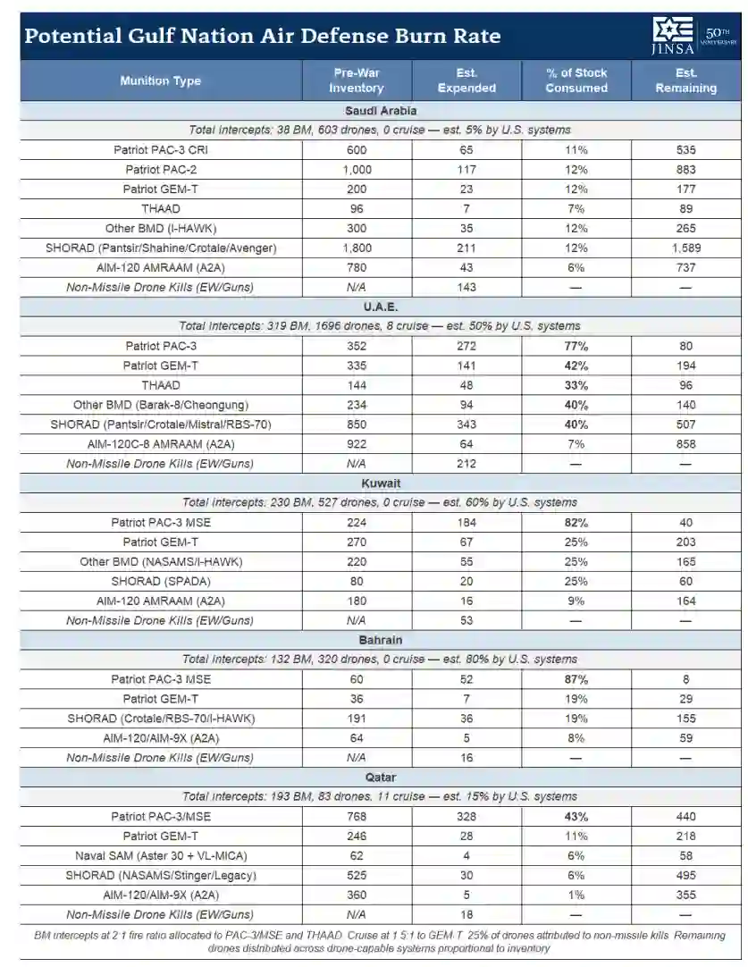 尽管美国和伙伴的系统在整个冲突中表现良好,但美国并没有足够的防空系统和拦截弹来长期维持整个地区的防御。分散的国家库存意味着,即使有拦截弹闲置在战区的其他地方,库存较小的国家也可能很快耗尽。防空理论通常包括对单个来袭威胁发射多枚拦截弹,特别是针对携带大型、破坏性有效载荷的弹道导弹,这意味着拦截弹的消耗速度比导弹或无人机的消耗更快。据报道,海湾国家警告美国官员,其导弹拦截弹库存已几乎耗尽。根据JINSA对各战前库存和潜在拦截弹使用情况的分析,沙特阿拉伯可能只消耗了其各种拦截弹的大约10%,但阿联酋和科威特可能已经消耗了其爱国者库存的大约75%。基于此评估,巴林可能已消耗了其爱国者库存的87%,而卡塔尔已使用了大约40%。实际的消耗率会因美国对拦截努力的贡献程度、以及基本库存估计和作战报告的准确性等因素而异。