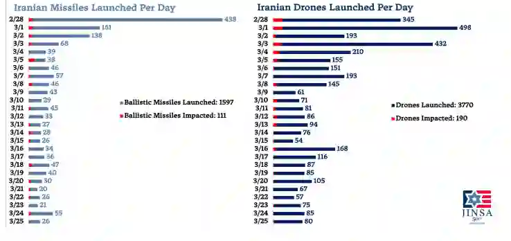 与2024年和2025年针对以色列的攻击不同,在当前冲突中,伊朗分散了其火力,向超过十二个国家发射了大约5,400枚投射武器——约1,560枚弹道导弹、3,770架无人机和28枚巡航导弹。伊朗火力的分散造成了广泛影响,但降低了火力密度,使其无法对一个国家保持足够的压力来持续压倒防御或完全耗尽拦截弹。