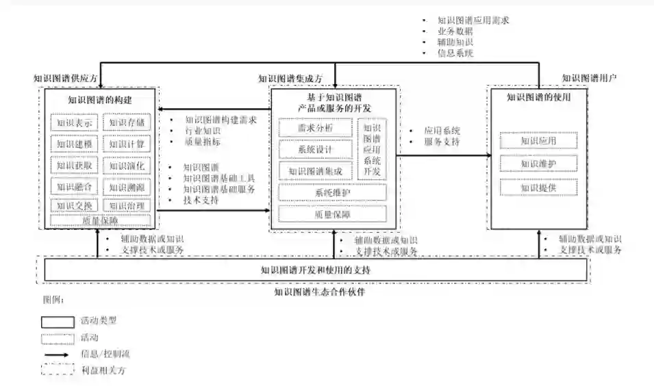 图2示出从构建到使用知识图谱涉及的各类技术活动的框架,简称技术框架。这些活动归纳为知识 图谱的构建、基于知识图谱的产品或服务的开发、知识图谱的使用、以及面向知识图谱开发和使用的 辅助支持四大类。