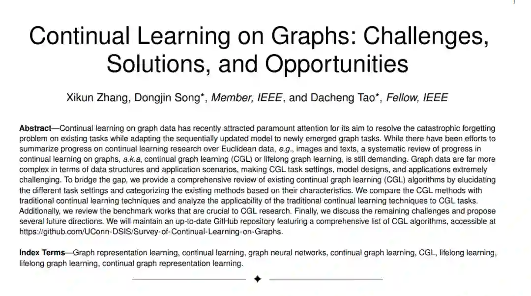图数据上的持续学习近期吸引了极大的关注,其目标是解决在现有任务上的灾难性遗忘问题,同时使序列更新的模型适应新出现的图任务。尽管已有努力总结了在欧几里得数据(例如,图像和文本)上持续学习研究的进展,但对于图上的持续学习,也就是所谓的持续图学习(CGL)或终身图学习,系统性的综述仍然是迫切需要的。图数据在数据结构和应用场景上的复杂性远远超过其他类型,使得CGL的任务设置、模型设计和应用变得极为挑战性。为了弥补这一差距,我们提供了一个关于现有持续图学习(CGL)算法的全面综述,通过阐明不同的任务设置并基于它们的特点对现有方法进行分类。我们将CGL方法与传统的持续学习技术进行比较,并分析了传统持续学习技术对CGL任务的适用性。此外,我们还回顾了对CGL研究至关重要的基准作品。最后,我们讨论了剩余的挑战并提出了几个未来的方向。我们将维护一个最新的GitHub仓库,其中包含CGL算法的全面列表,可在https://github.com/UConn-DSIS/Survey-of-Continual-Learning-on-Graphs 访问。