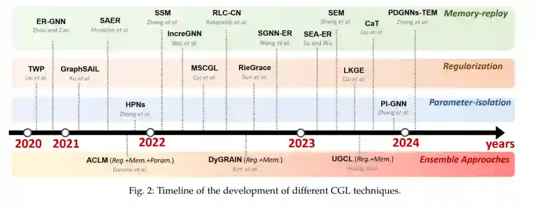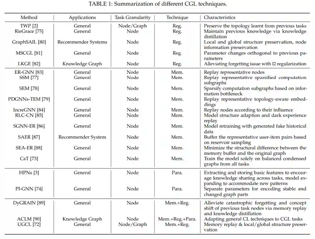 与传统持续学习类似,CGL也从限制模型参数的变化、隔离和保护对以前学习的任务重要的参数,以及回放先前任务的代表性数据以提醒模型先前学习的模式(图2)的角度来处理问题。然而,CGL的一个关键挑战是必须适当地保留数据的拓扑结构,这是图数据中包含的关键信息。在本节中,我们将按照这一分类介绍CGL技术,这也在表1中总结。