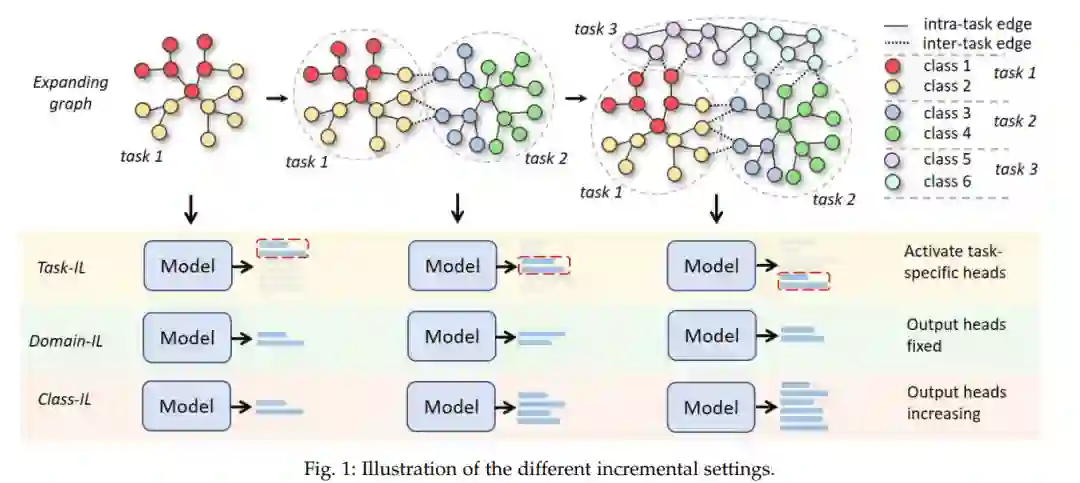 在图表示学习领域,传统方法通常假设图是静态的,即图的结构以及其属性节点和边缘保持不变。然而,在许多现实世界应用中,包括节点级别和图级别的场景,图可能会不断演化。这意味着可能会出现新类型的节点及其相关边缘,或者可能会收集到新类型的图。在这种情况下,图数据可能会表现出分布偏移,期望的模型应该能够持续适应新的分布,而不会忘记之前学到的知识。例如,在引用网络中,新类别的研究论文(图节点)和随之而来的引用(图边缘)将不断出现。为了自动分类这些论文,文档分类器需要持续适应新类别的分布,同时保持对先前观察到的类别所学知识的记忆[1]、[2]、[3]。在药物发现中,可能会间歇性遇到新的分子属性和新的分子类别,分子属性预测器必须适应新模式的参数,而不损害对现有分子类别或属性的预测性能[1]、[2]。在这种持续学习场景中,天真地将模型适应新任务将遇到灾难性遗忘问题,即在模型参数适应新任务后,现有任务的性能急剧下降。一个简单的解决方案是每当出现新任务时,就重新训练模型处理所有之前观察到的数据。然而,这可能因难以承受的重新训练成本或潜在的隐私/法律规定问题而变得不可行。 鉴于此,持续图学习(CGL),旨在持续学习新任务而不忘记以前学到的知识,最近在各个领域受到越来越多的关注[1]、[2]、[4]-[23]。由于图数据的复杂性,现有的CGL方法在目标图类型、学习设置、基本技术和评估指标方面高度异质。首先,现有方法可能提出一般技术或针对某些应用场景(例如,知识图谱、推荐系统等)的专门技术。其次,根据测试期间任务标识的可用性,CGL方法可能采用不同的设置,包括任务增量学习(task-IL)、领域增量学习(domain-IL)和类别增量学习(class-IL)。除了增量设置,图学习任务还可能关注不同的粒度,包括节点级任务和图级任务。第三,各种现有方法采用的方法论与不同的主流趋势一致,如正则化、记忆重放和参数隔离。最后,与标准学习设置不同,CGL模型的性能关注不同的视角,包括总体性能、性能下降(遗忘)、任务间干扰等。因此,根据研究目标,不同的工作可能采用不同的指标来评估模型。这些CGL研究的正交维度呈现了复杂的挑战和研究人员试图进入该领域时的重大障碍。 为此,本文提供了一项系统的综述,从前述四个不同的视角审视现有方法。在第二节中,我们简要介绍了持续学习、CGL以及CGL与其他相关研究领域在动态演化图上的区别的背景信息。在第三节中,我们从基本概念、任务序列构建、任务粒度和不同增量学习场景的角度解释了CGL的问题设置。在第四节中,我们首先系统地回顾了遵循三种主流方法的相关CGL工作,包括基于正则化的、基于记忆回放的和基于参数隔离的方法,然后分析了传统持续学习技术的适用性。在第六节中,我们介绍了旨在提供一致的实验设置和公平平台以比较不同技术的最近提出的基准工作。最后,在第七节中,我们讨论了现有的挑战并强调了CGL研究的有前途的未来方向。